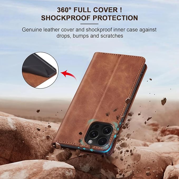 Jasonyu Flip Wallet Case for iPhone 15 Pro Max,Leather Magnetic Folio Cover with Card Holder,Kickstand - TPU Shockproof Durable Protective Phone Case,Brown