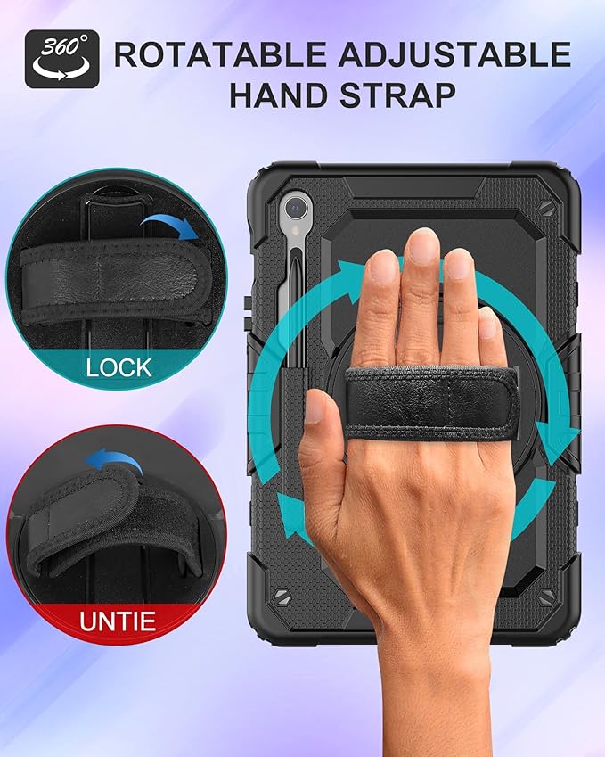 - 360° Rotatable Kickstand & Hand Strap: 360° rotating stand and hand strap can help you easily use the Tab S10 Lite/ S10 FE/ S9 FE/ S9 for Samsung Galaxy. It feels comfortable and easy to use, flexible in vertical & horizontal any other angles ideal for watching video, reading or teaching, maximally free your hands. Adjustable hand strap suitable uses for all size of hands, adults, students