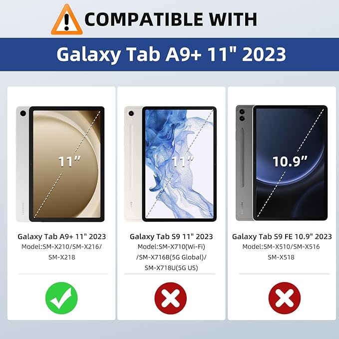 - Compatibility: Specially designed for Samsung Galaxy Tab A9 Plus 11-Inch 2023 Release (Model: SM-X210/SM-X216/SM-X218). It will NOT work for any other model device, please confirm the model number before purchase. The precise cutouts allows easy access to all buttons, ports, sensors, speakers & camera.