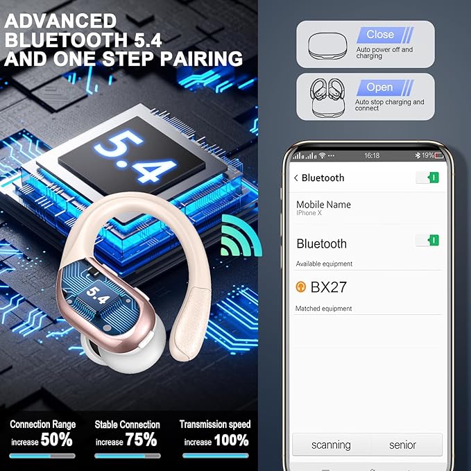 - Bluetooth 5.4 Technology and Extensive Compatibility: Wireless Bluetooth headphones are powered by advanced Bluetooth 5.4 technology, minimizing the chances of interference and disconnections. This ensures a faster and more stable connection between the Bluetooth earphones inear and your devices. These wireless earphones for sports are compatible with almost all Bluetooth-enabled devices such as iOS, Android cellphones, TV, smart watches, PC, tablets, laptops, and more (Not compatible with gaming devices).