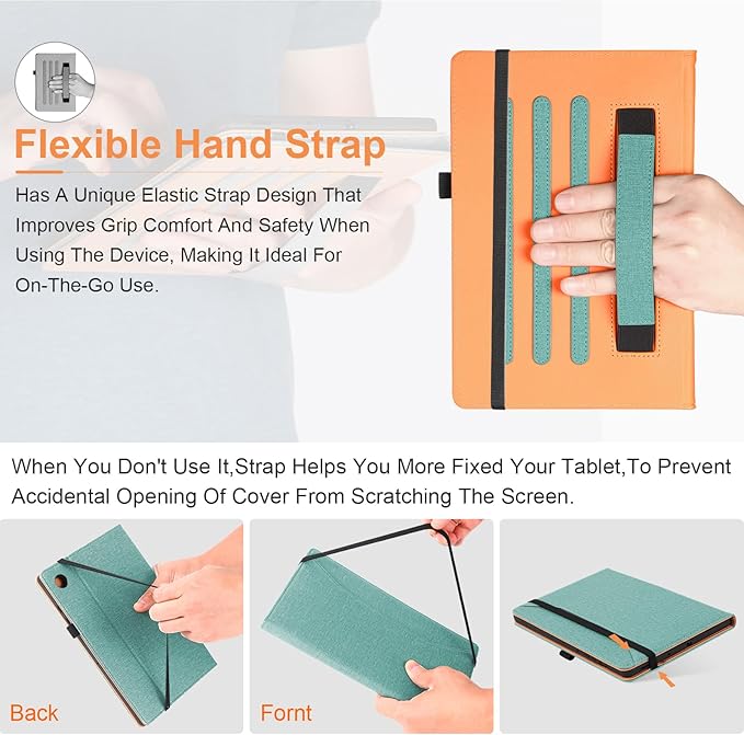 - Multifunctional Portable: 1.External Elastic Fixing Band Keep The Case Closed,Without Fear Of Accidental Opening. 2.Elastic Hand Straps Help You Hold The Tablet Comfortably and Tightly, Improve Safety When Using The Device. 3.Front Pocket Design Storages Your Cards,Cash,Photo,Paper Documents And Etc.