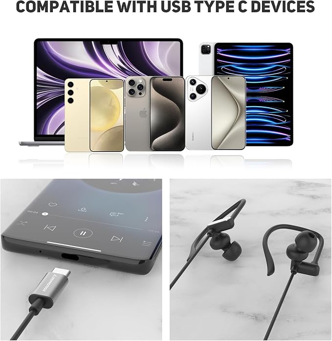 USB C Headphones with Microphone Wired USB C Earphones for Sports and Running Type C Earbuds Hooks Volume Control, Compatible with iPhone 16/15, Samsung, Google and Other Type C Smart Phone, Black