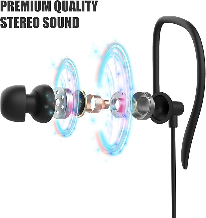 - 【Sports Headphones with Ear Hooks】The earphones are ergonomically designed to keep the user steady during exercise, It is not painful or uncomfortable to wear for a long time, and makes them a great companion for your run, jog, or workout. 3 different sizes of silicone ear tips ensure an optimal fit with your ears.