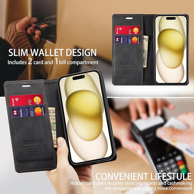 - 【Multi-Function】: IPhone 15 5G thin wallet case with 2 Card Slots & 1 Side Pocket, Perfect Combination of wallet and cell phone case.Allows you to easily access your cards or cash conveniently,minimizing the need to carry extrasSuitable for everyday life and business trip. Efficient magnetic lock will ensure your phone cover closed and protected when not in use.