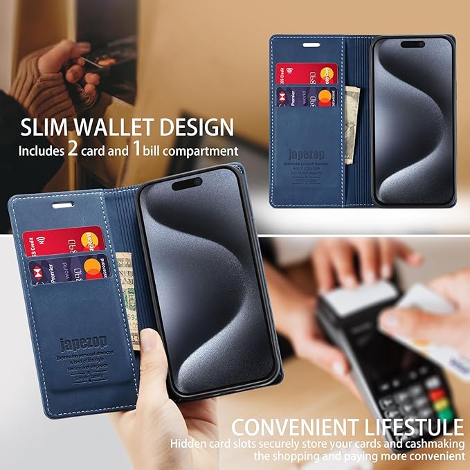 - 【Multi-Function】:IPhone 15 Pro 5G thin wallet case with 2 Card Slots & 1 Side Pocket, Perfect Combination of wallet and cell phone case.Allows you to easily access your cards or cash conveniently,minimizing the need to carry extrasSuitable for everyday life and business trip.Efficient magnetic lock will ensure your phone cover closed and protected when not in use.
