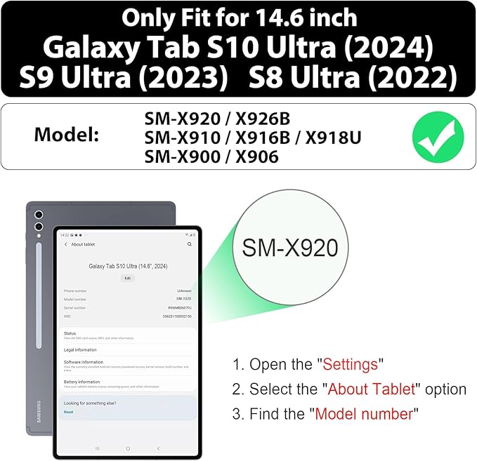 - Compatibility: Only fit for Samsung Galaxy Tab S10 Ultra 2024 14.6'' (Model: SM-X920/X926B), for Samsung Galaxy Tab S9 Ultra 14.6'' (Model: SM-X910/X916B); for Galaxy Tab S8 Ultra 14.6'' (SM-X900/X906); please confirm the model (SM-X***) before purchase.