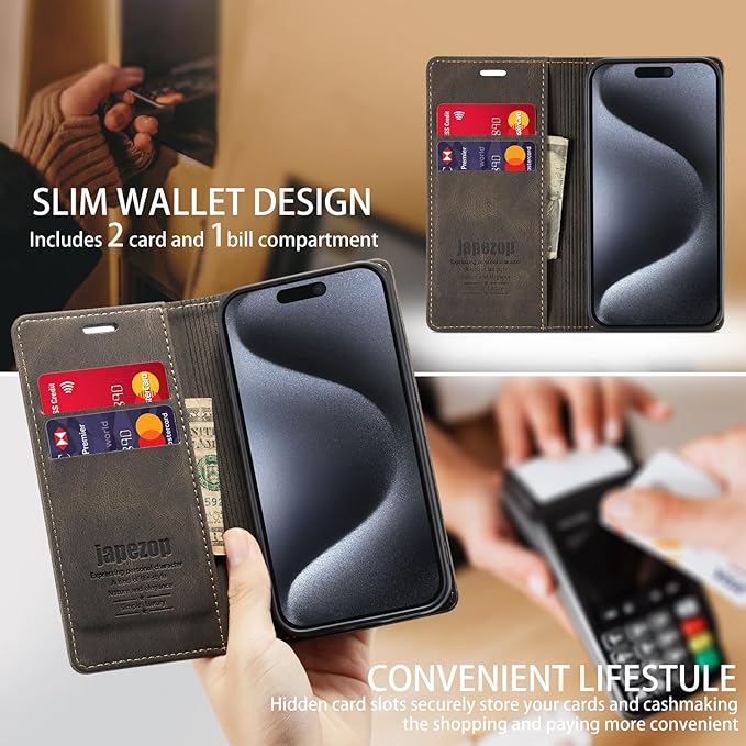 - 【Multi-Function】:IPhone 15 Pro 5G thin wallet case with 2 Card Slots & 1 Side Pocket, Perfect Combination of wallet and cell phone case.Allows you to easily access your cards or cash conveniently,minimizing the need to carry extrasSuitable for everyday life and business trip.Efficient magnetic lock will ensure your phone cover closed and protected when not in use.