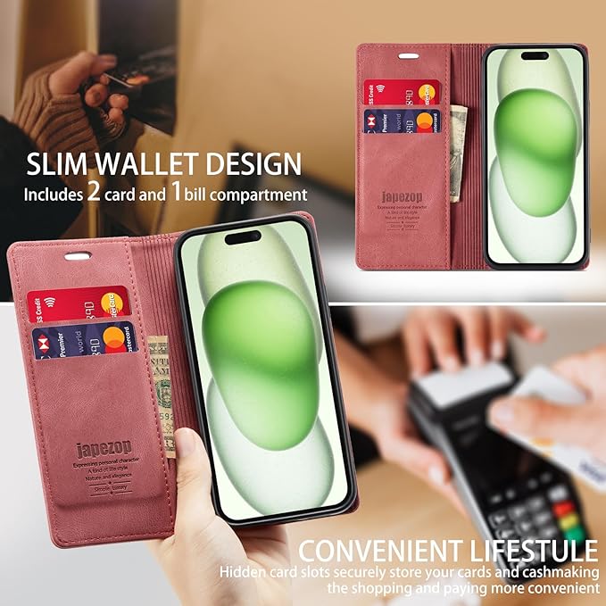 - 【Multi-Function】:IPhone 15 Plus 5G thin wallet case with 2 Card Slots & 1 Side Pocket, Perfect Combination of wallet and cell phone case.Allows you to easily access your cards or cash conveniently,minimizing the need to carry extrasSuitable for everyday life and business trip.Efficient magnetic lock will ensure your phone cover closed and protected when not in use.