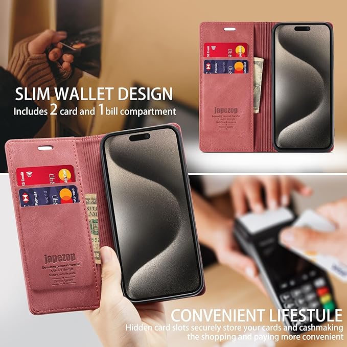 japezop iPhone 15 Pro Max 5G Wallet Case with [RFID Blocking],Card Holder Kickstand Magnetic,Leather Flip Case Wallet for iPhone 15 Pro Max 5G 6.7 Inch(Red)