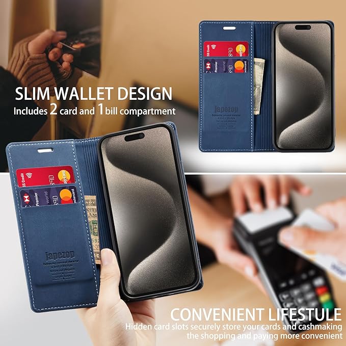 japezop iPhone 15 Pro Max 5G Wallet Case with [RFID Blocking],Card Holder Kickstand Magnetic,Leather Flip Case Wallet for iPhone 15 Pro Max 5G 6.7 Inch(Blue)