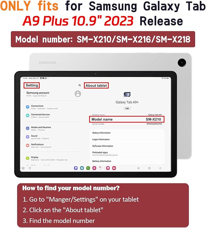 - Compatible Devices : (SM-X210/X216/X218), Samsung Galaxy Tab A9 Plus 2023 11", Samsung Galaxy Tab A9+ 2023 11 inch