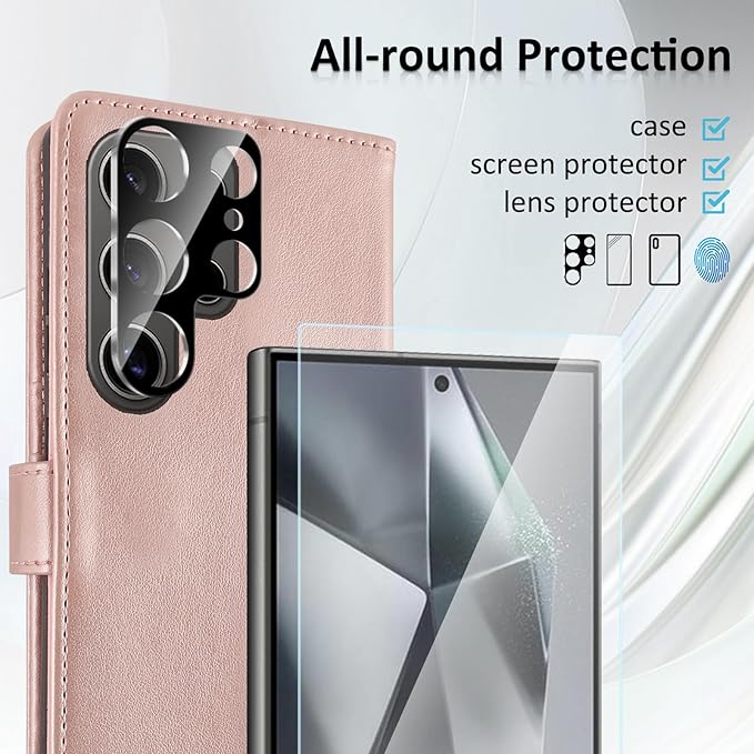 - Compatibility and Convenience Design: Compatible for samsung galaxy S24 Ultra 5G 6.8 inch, this flip folio leather wallet case with card slot holder and a cash pocket can store credit cards and up to 4 bills. Comes with glass screen protector and lens protector, all-round protection for your mobile phone. Internal RFID blocking interlayer material to keep your personal information safe.