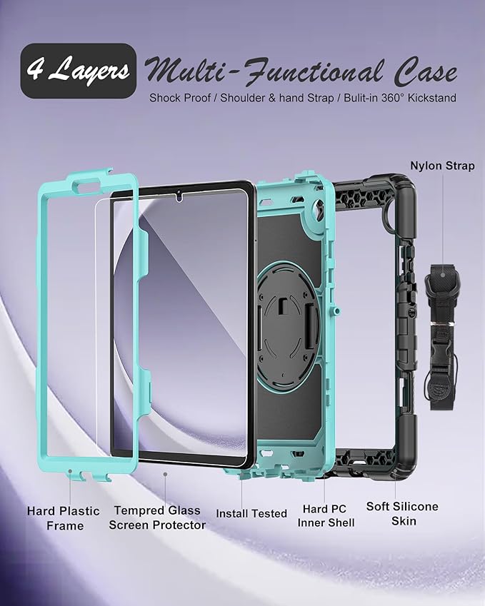 - Durable Protection: The Rugged Case for Samsung Galaxy Tab A9 protecting your tablet from inside out is composed of a soft outer silicone, a rigid PC inner shell and a top PC frame. It can absorb the impact from accident drop or shock, anti-collision, anti-dirt, anti-scratch. Friendly material makes it convenient for both student and teachers