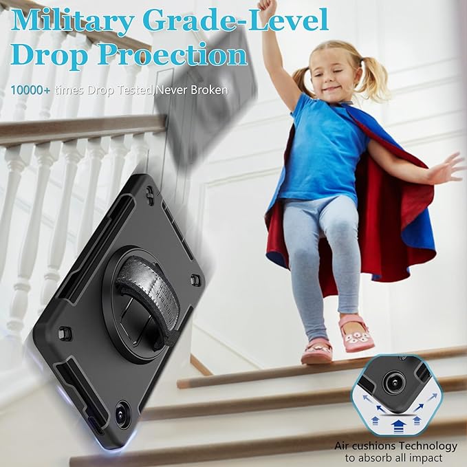 - MATERIAL COMPOSITION: This Case for galaxy tab A9 Plus has a built-in screen protector. The inner cover are Made from Hard PC and outer layer Fexible TPU. Our triple defense system has passed the Military Grade Drop Test [MIL-STD 810G-516.6] and can withstand shocks and drops from up to 15 feet, 10,000 times. These shock-absorbent layers incorporate Air Cushion Technology to effectively protect your iPad Air 11 2024 from accidental drops, bumps, and scratches