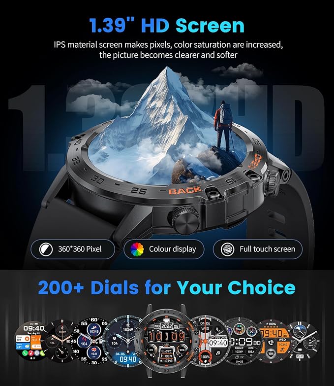 - 【Advanced Touch and Stunning Visuals】This military smartwatch features a 1.4-inch display with a high resolution of 360x360, delivering a smooth operation and a clearer, brighter, and more detailed visual experience. The package includes comprehensive instructions to help you operate the smartwatch with ease. Two strap options are available, with a standard strap width of 22mm.