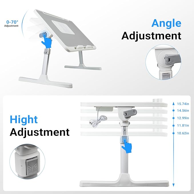 - 【📐Adjustable Size for Optimal Use】Measuring 15.74 x 23.62 inches(60*40cm), this height-adjustable laptop table adapts from 10.62" to 15.74"(27-40cm), thanks to its convenient auto-lock buttons. Its foldable legs ensure easy storage, and the 24.4 inches leg clearance offers comfortable movement. The tabletop's angle is adjustable up to 70°, promoting better posture and reducing strain.