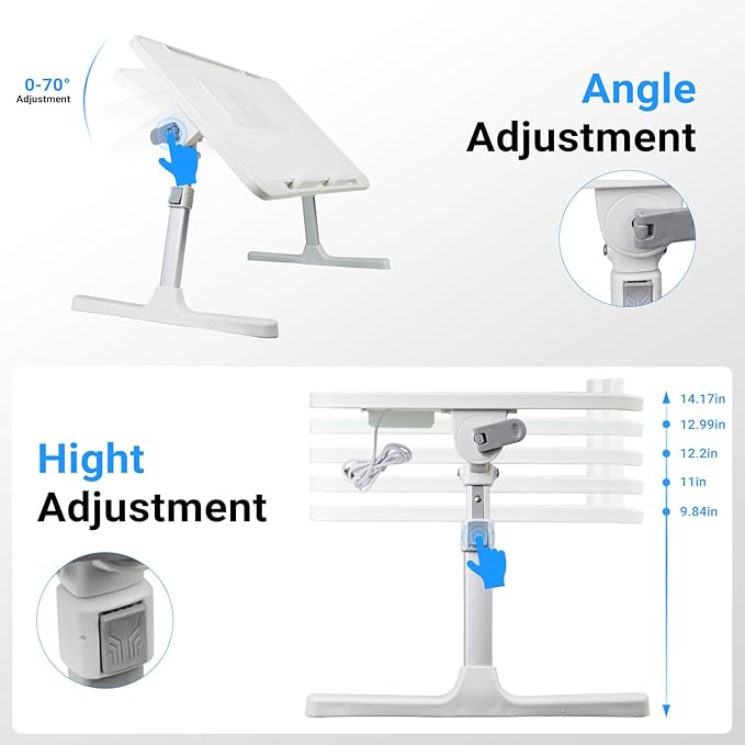 Laptop Lap Desk with Cooling Fan - Adjustable with Light, USB, Storage Drawer - Folding Bed Desk,22.04"*12.59",White
