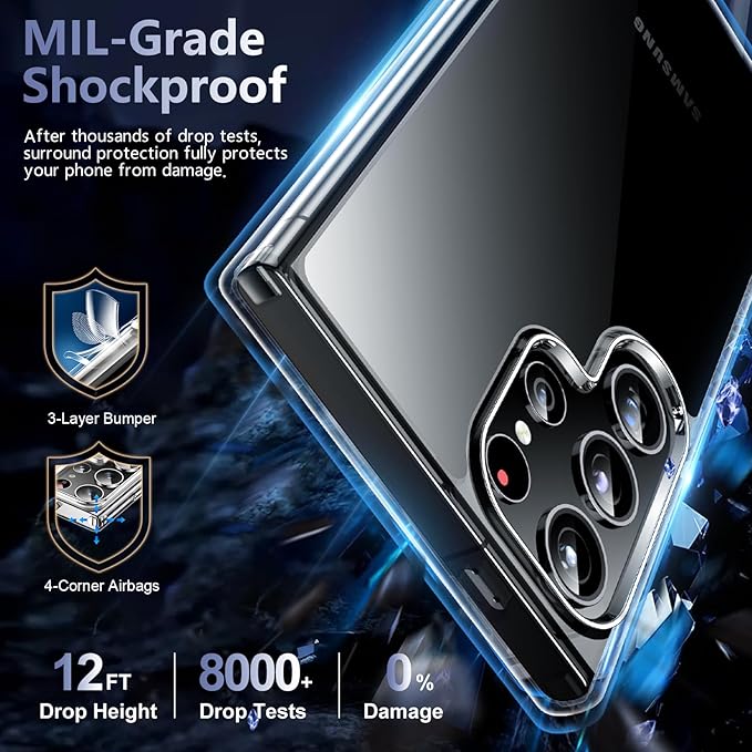- [Military-Grade Drop Protection] Certified by SGS (MIL-STD-810H), this Samsung Galaxy S24 Ultra Case has survived over 3,000 12FT drop tests. Additionally, this S24 Ultra case features multiple cushioning structures and 4-corner Upgraded airbags, dispersing the 99% of impact force, layer by layer. It provides optimum drop protection, effectively protects your phone from drops, scratches. A raised bezel around the camera and screen provide reliable protection for the vital parts of the phone