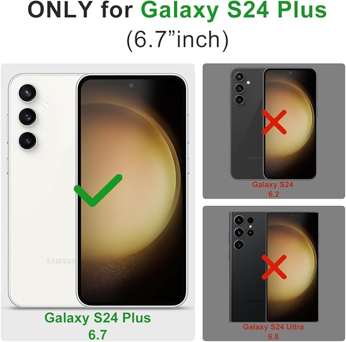 - [Compatibility] The Case compatible with Samsung Galaxy S24 Plus (6.7", 2024 Release) ONLY. NOT fit Samsung Galaxy S24 (6.2"), Samsung Galaxy S24 Ultra (6.8") , or other phones. Please check your phone model that is correct before placing an order