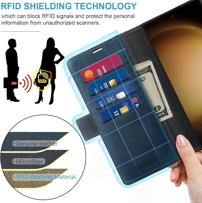 - [MULTIFUNCTION] - (1). This Galaxy S24 Plus Wallet Case designed with RFID shielding technology which can block RFID signals and protect the personal information from unauthorized scanners. (2). Included 3 card slots and 1 money pocket, carry around your credit and debit cards, and cash. TIPS - The more cards put into, the magnetic closure function will be weaker. Please place the proper amount of cards. (3). Magnetic flap to keep it closed and protected, secure magnetic closure