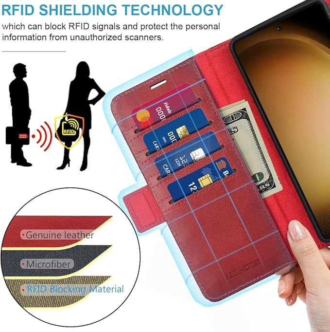 - [MULTIFUNCTION] - (1). This Galaxy S24 Plus Wallet Case designed with RFID shielding technology which can block RFID signals and protect the personal information from unauthorized scanners. (2). Included 3 card slots and 1 money pocket, carry around your credit and debit cards, and cash. TIPS - The more cards put into, the magnetic closure function will be weaker. Please place the proper amount of cards. (3). Magnetic flap to keep it closed and protected, secure magnetic closure