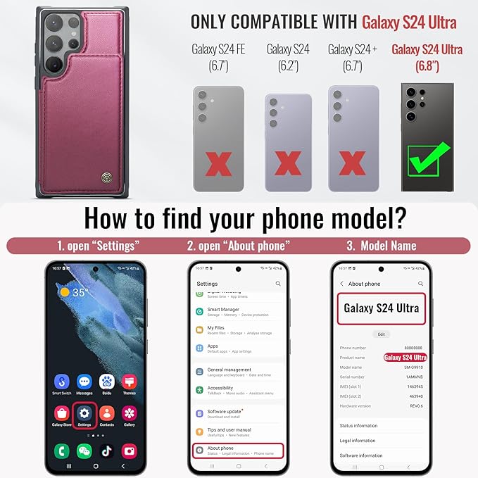 - for Samsung S24 Ultra Case with Card Holder: The for Galaxy S24 Ultra case is designed with card slots for drivers license, insurance cards, door access card, debit cards, etc; The case is easy to hold and remove, so you don’t need to take bulky purse to outdoor; This case for S24 Ultra is suitable for all ages of women & men
