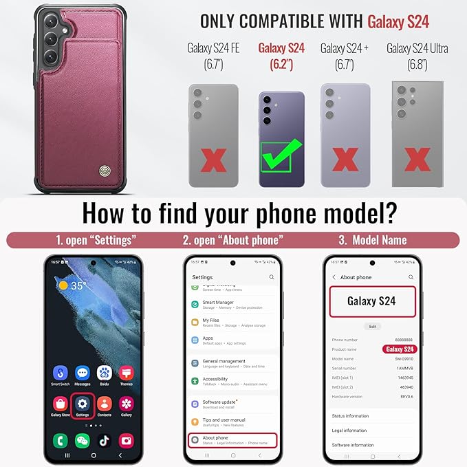 - for Samsung Galaxy S24 Case Wallet: Made of high quality durable PU leather and soft TPU inner shell, the craftsmanship phone wallet case is compatible with Galaxy S24; The case for Samsung S24 will make your work and life more convenient while protecting your phone