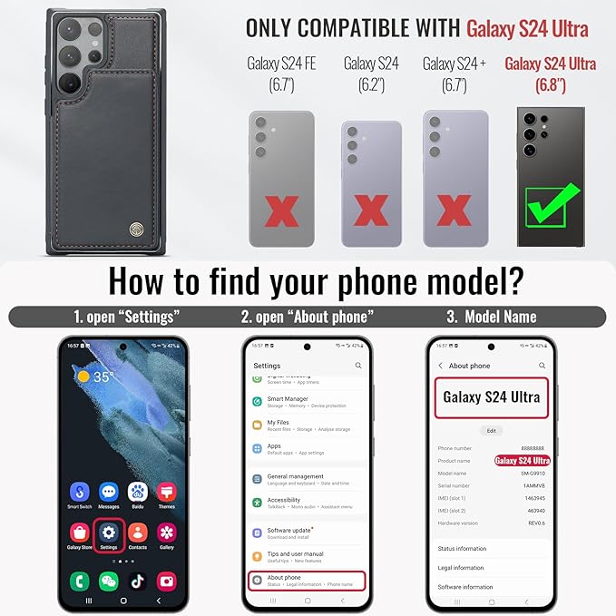 - for Samsung S24 Ultra Case with Card Holder: The for Galaxy S24 Ultra case is designed with card slots for drivers license, insurance cards, door access card, debit cards, etc; The case is easy to hold and remove, so you don’t need to take bulky purse to outdoor; This case for S24 Ultra is suitable for all ages of women & men