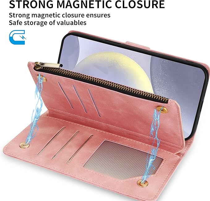 ZZXX for Samsung Galaxy S24 Plus Wallet Case with RFID Blocking Card Slot PU Leather Zipper Flip Folio with Strap Kickstand Protective Cover for Samsung Galaxy S24+ Case Wallet(Pink-6.7 inch)