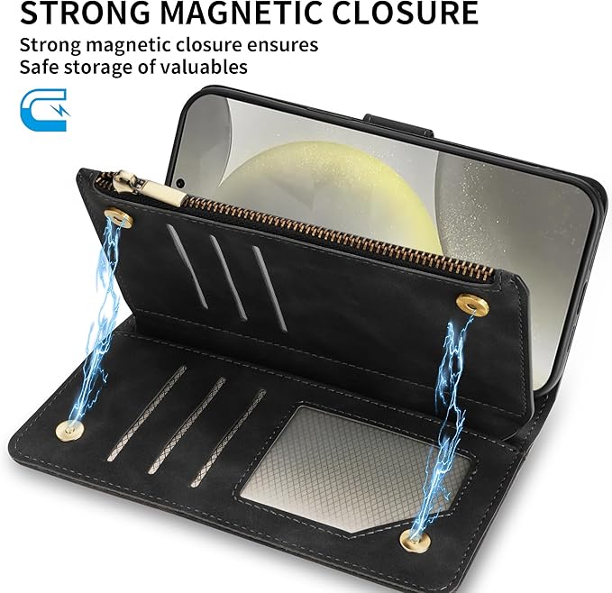 ZZXX for Samsung Galaxy S24 Wallet Case with RFID Blocking Card Slot PU Leather Zipper Flip Folio with Strap Kickstand Protective Cover for Samsung Galaxy S24 Case Wallet(Black-6.2 inch)