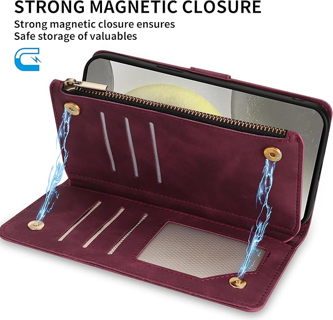 ZZXX for Samsung Galaxy S24 Wallet Case with RFID Blocking Card Slot PU Leather Zipper Flip Folio with Strap Kickstand Protective Cover for Samsung Galaxy S24 Case Wallet(Wine Red-6.2 inch)