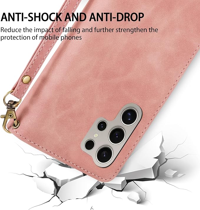 ZZXX for Samsung Galaxy S24 Ultra Wallet Case with RFID Blocking Card Slot PU Leather Zipper Flip Folio with Strap Kickstand Protective Cover for Samsung Galaxy S24 Ultra Case Wallet(Pink-6.8 inch)