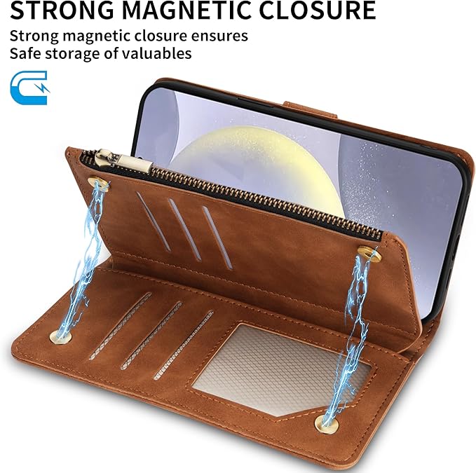 ZZXX for Samsung Galaxy S24 Plus Wallet Case with RFID Blocking Card Slot PU Leather Zipper Flip Folio with Strap Kickstand Protective Cover for Samsung Galaxy S24+ Case Wallet(Brown-6.7 inch)