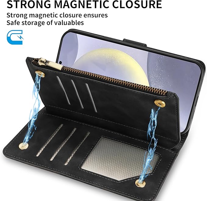 ZZXX for Samsung Galaxy S24 Plus Wallet Case with RFID Blocking Card Slot PU Leather Zipper Flip Folio with Strap Kickstand Protective Cover for Samsung Galaxy S24+ Case Wallet(Black-6.7 inch)