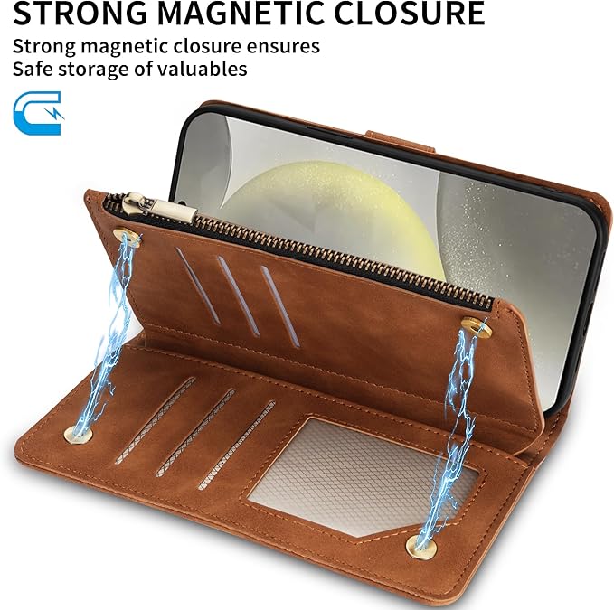 ZZXX for Samsung Galaxy S24 Wallet Case with RFID Blocking Card Slot PU Leather Zipper Flip Folio with Strap Kickstand Protective Cover for Samsung Galaxy S24 Case Wallet(Brown-6.2 inch)
