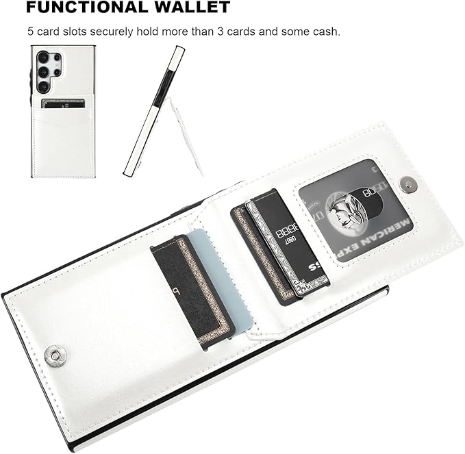 - [FUNCTIONAL WALLET]: 4 Card Slots Securely Hold more than 3 cards and Some Cash(IDs, Debit Cards, Credit Cards, Drivers License, etc.) without taking your wallet outside. Magnetic Buttons can keep your case slim and stylish and keep your cash and cards secure.