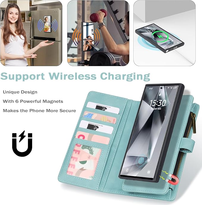 - [Full Protection & Detachable] - This magnetic galaxy s24 ultra case can be easily taken out for use alone, or connected by powerfully magnetism to wallet ,soft leather 360° full coverage,which protects your phone from drop damage and daily scratch. The wrist strap of the wallet case is removable too.