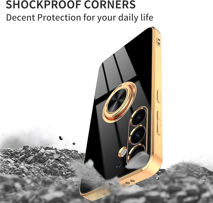 Dinick Black for Samsung Galaxy S24 Case with Ring Holder Kickstand [with Magnetic] Soft TPU Bumper, Glitter Gold Electroplated Cover Slim Thin Protective Phone Case for Galaxy S24