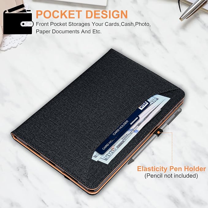 - Multifunctional Portable: 1.External Elastic Fixing Band Keep The Case Closed,Without Fear Of Accidental Opening. 2. Exterior Elastic Pen Loop Holds Your S Pen Firmly In Place To Prevent Drops Or Loss. 3.Elastic Hand Straps Help You Hold The Tablet Comfortably and Tightly, Improve Safety When Using The Device. 3.Front Pocket Design Storages Your Cards,Cash,Photo,Paper Documents And Etc.