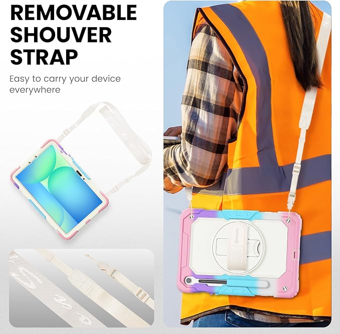 - MULTI-ANGLE FUNCTIONALITY: 360° rotating stand with 5 positions for video calls, notes, or viewing; Detachable shoulder strap for commutes; Anti-slip hand strap secures during outdoor work; Dedicated S Pen holder for hiking/transport