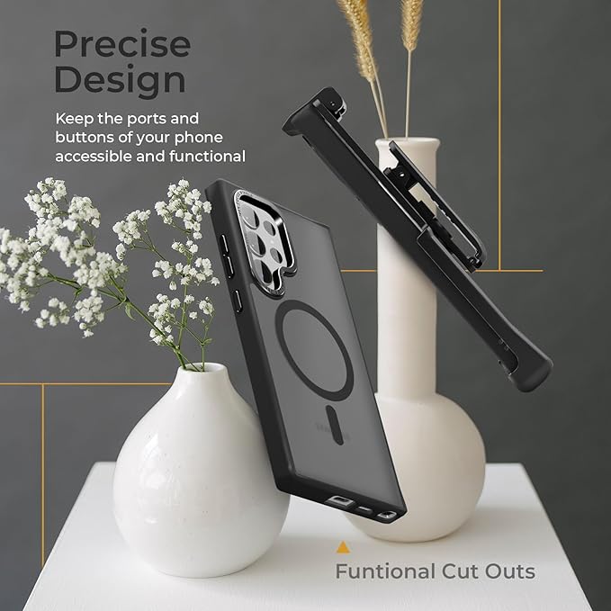 - ❄[THE FROSTED CLEAR SERIES]: Semi-Clear Protection in Style, a matte and textured Surface that diffuses light. Our samsung galaxy s24 ultra case with belt clip is elegance. Designed for Samsung galaxy s24 ultra holster, this froste clear phone case back is opaque and translucent, it looks great while preserving your device's sleek aesthetics while providing reliable protection. S24 ultra case with holster has precise cutouts too, allowing perfect access to camera, microphone, etc. Explore a blend of style and defense