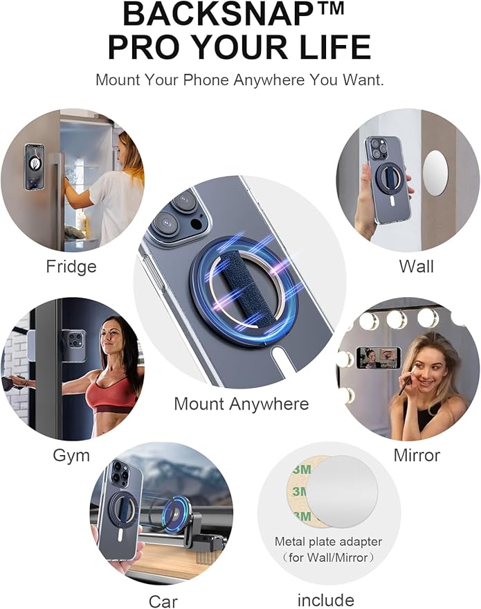 - 【BackSnap Pro Your Life】 Dual-Sided Magnetic makes both sides of the grip have magnetic functions! The side that attaches to the phone can hold weight of 6 iPhone 16, and the back can stuck to any iron surface (like fitness equipment, refrigerator, or metal shelves) and any non-iron surface (like mirror, bathroom, or wood furniture) with the iron sheet included. Freeing your hands for your phone viewing. Easily detachable.