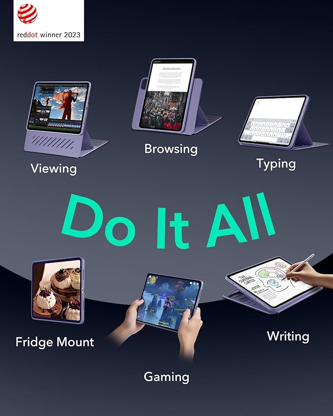 - Powerful Versatility: achieve up to 9 different angles, 6 for viewing and 3 for writing, via the dual support brackets and 6 magnetic grooves, then instantly detach for hands-on gaming or to magnetically attach to your fridge