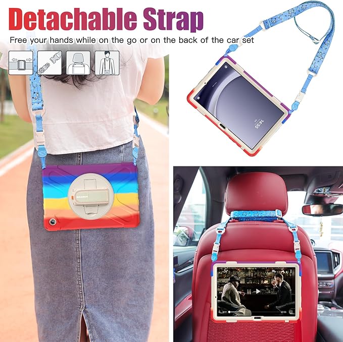 - Adjustable Shoulder Strap: The Samsung Tab A9+ Plus Tablet Case comes with a adjustable detachable shoulder strap, so that you can carry your tablet on neck or shoulder like a bag, or sling it on car head rest. It's ideal for carrying on travel, at work, in school or outdoors