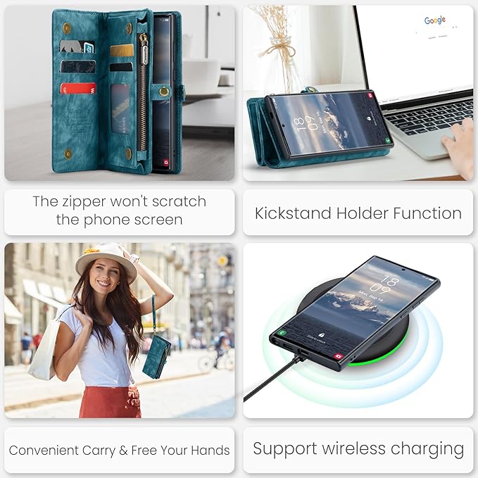 - 【Multi-Function】This Galaxy S24 Ultra case with card holder offers 8 card slots for credit cards, ID, business cards and 1 cash slots for cash , a zipper pocket for receipt and bills .
