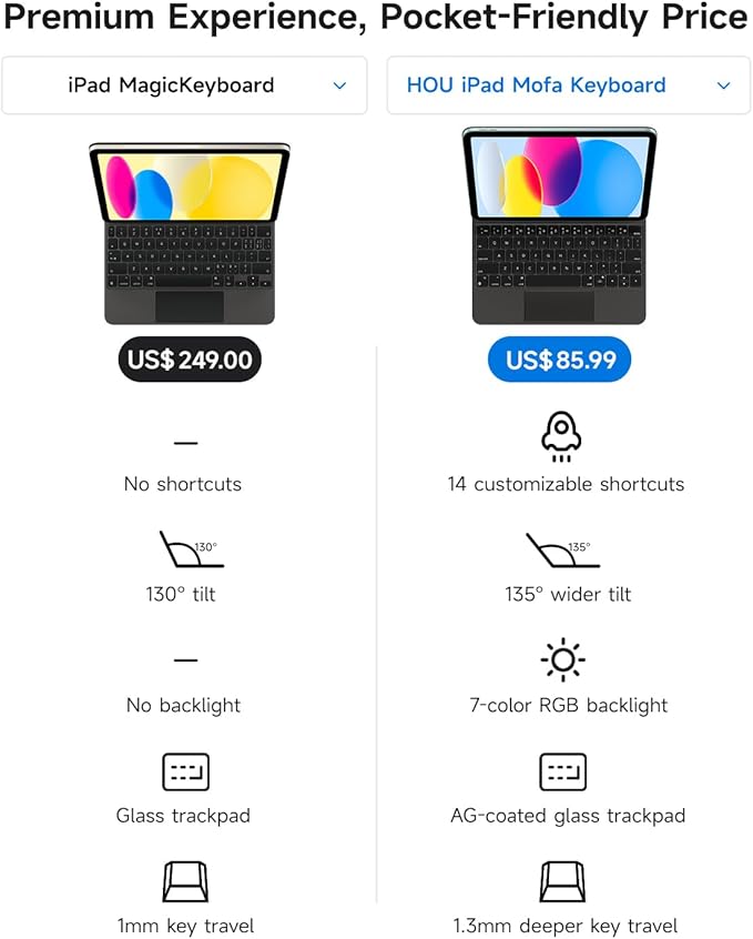 HOU Keyboard Case for iPad A16 11/10, Magnetic Magic-Stand, Floating Design, Durable Spindles, Multi-Touch Trackpad, 7 Colors Backlit, Stain Resistant PU, Bluetooth