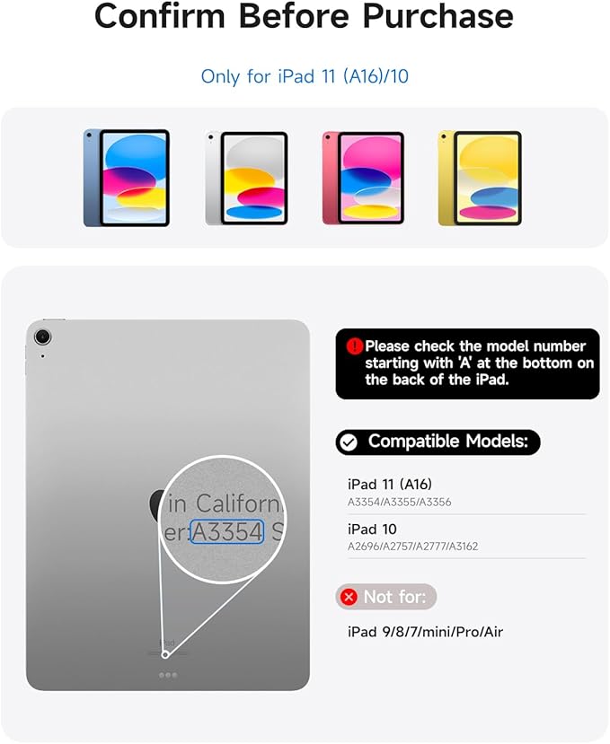 - 【Compatibility】Exclusively Compatible with iPad 11 inch A16 2025, iPad 10th Generation Keyboard 10.9 inch (2022) (A2696, A2757, A2777). Please verify your model number before purchase to ensure compatibility.