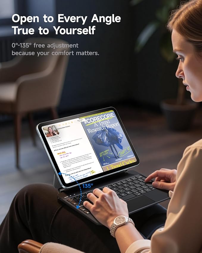 - 【7 Colors & 3 Modes Eye-Friendly Backlit】Illuminate your workspace with our 7-color backlit keyboard for ipad 10th generation. With 3 adjustable brightness levels, protect your eyesight while enjoying a personalized typing experience tailored to your using environment.
