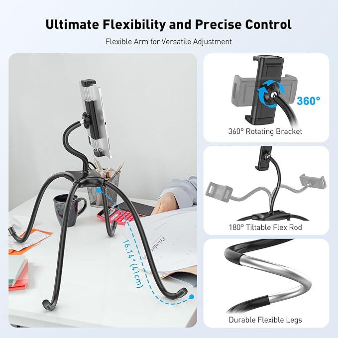 - Robust Build: Crafted from durable ABS, PVC, and Carbon Steel, our ipad bed holder stand is built to last. With four support rods, it promises steadiness and uninterrupted interaction, supporting even heavy devices without wobbling—ideal for everyday use across multiple devices.