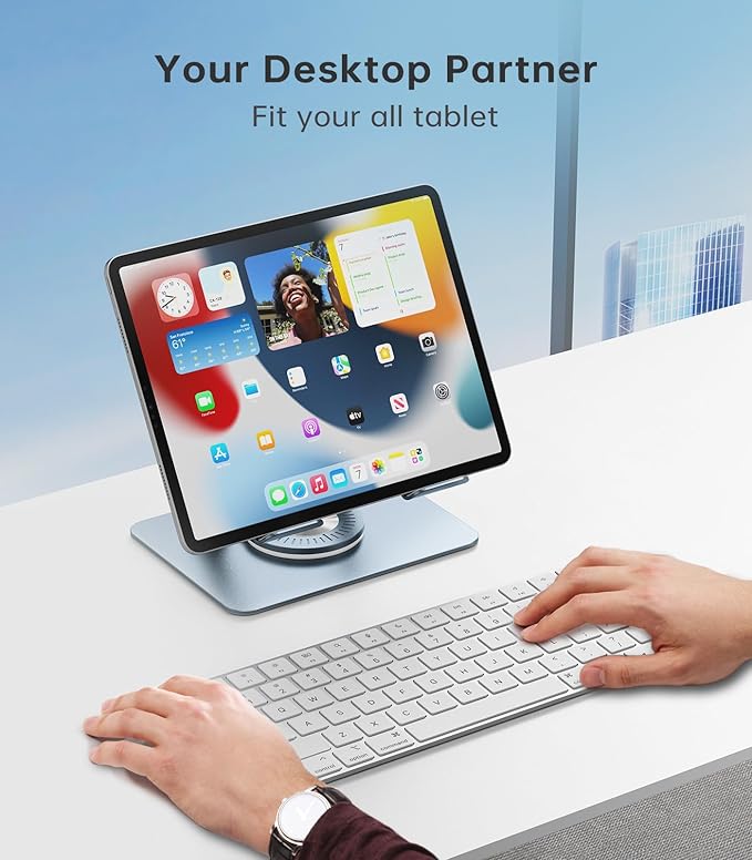 - Rotatable & Convenient. With a 360° rotation base, you can freely adjust the angle of the tablet stand holder to set the best viewing angle that suits your preference, also making it extremely easy to share content.